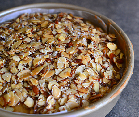 10 minutes before the cake is done, place butter, sugar, and milk in a pot and bring to a boil. Let simmer for five minutes then add the almonds. Spread the almond mixture on top of the cake, even it out with a spatula, and sprinkle with some flaky sea salt.