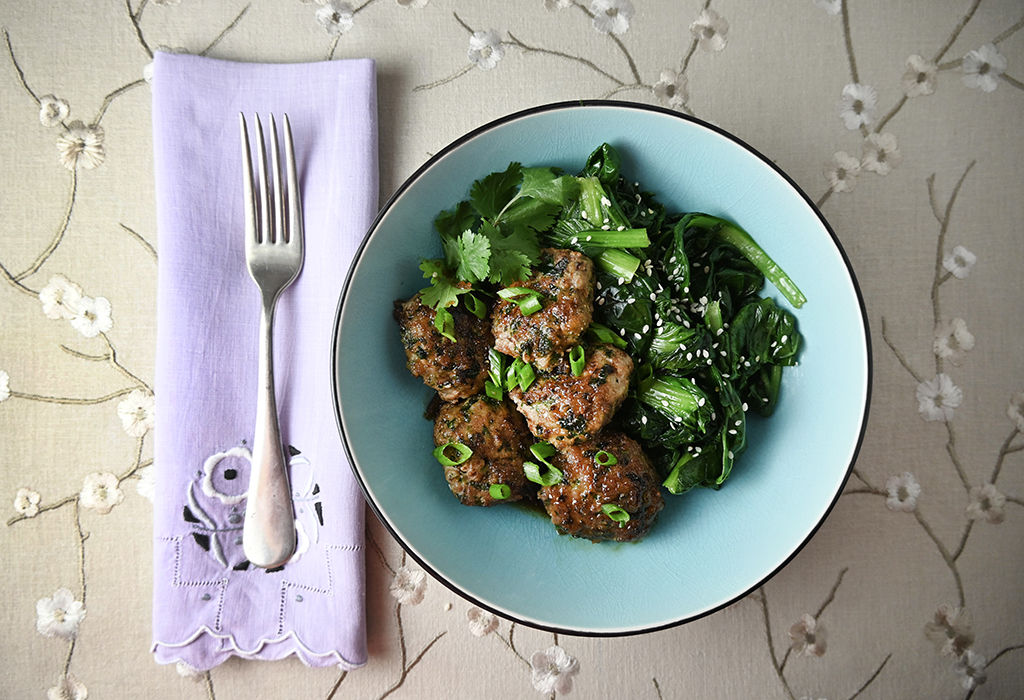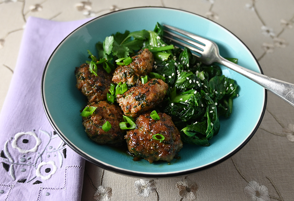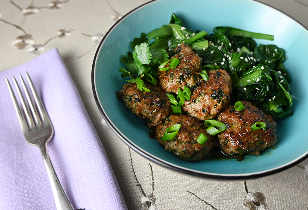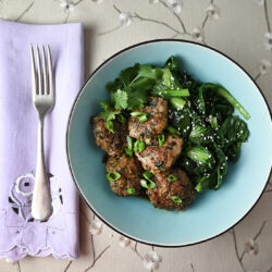After a bit of tweaking — using pork instead of turkey, flattening the meatballs to patties, cutting the glaze in half, adding an extra ingredient or two, and coming up with a nice plating — I am thrilled with the results. For the best texture and flavor, don’t buy the leanest ground pork, or the patties will be dry and the overall flavor will not be as good.