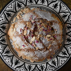 • Dust the top with confectioners sugar, lines of cinnamon in a pattern, then sprinkle on some sliced almonds, and few rose petals. Allow to cool for a few minutes to solidify before serving.
