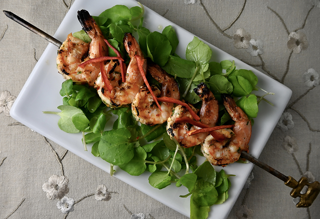- Heat grill to high. Place five or six shrimp on each of four metal skewers. Reduce grill heat to medium and add shrimp skewers, cooking about 2 minutes on the first side and 1 minute on the second, until pink and firm. Allow them to cool slightly, then place a skewer of shrimp on the bed of watercress on each plate. Garnish with the red pepper slivers and serve.